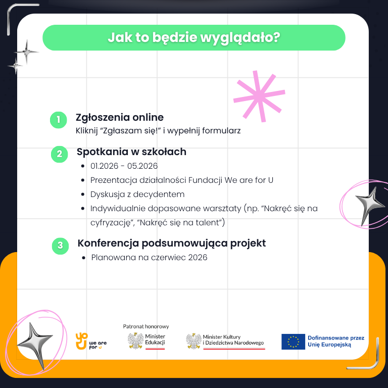 Rekrutacja szkół trwa do 30 kwietnia 2026 roku, a spotkania w szkołach będą odbywać się w okresie od stycznia do maja 2026. W każdym spotkaniu weźmie udział min. 35 uczniów w przedziale wiekowym 15 – 18 lat. Całość zwieńczy konferencja finałowa w czerwcu 2026 roku, w której udział weźmie 100 uczestników z całej Polski.